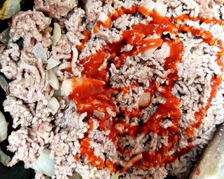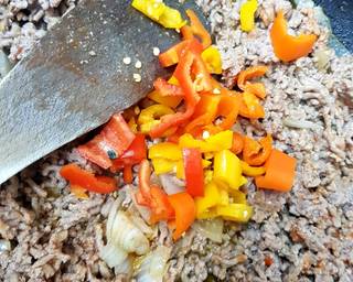 - Next add the mince and Italian herbs and pepper mix in and fry until mince is coloured. Simmer for 10 minutes. Add the Sriracha sauce and mix in then add the chopped sweet peppers and carry on simmering turn