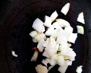 - Add the chilli oil and heat up. Then the chopped onion and fry for 1 minute