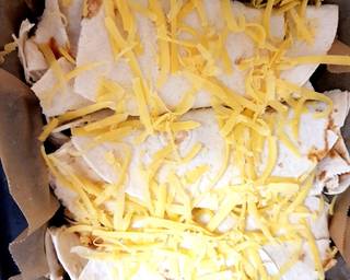 - Sprinkle Chedder cheese mild grate over the cheese wraps. Then a little mature Chedder cheese on top then slice a piece of Brie cheese to go on top of each one.