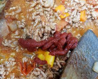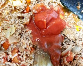 - Add the tin of tomatoes and mix in. Then add the dried beef stock cube. Stir in carry on simmering for a few minutes more.